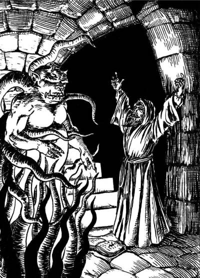 Demons always appear with a trident cursed with a Blade of Sharpness, always count as if they were wearing mail & plate and have two arcane spells each. Both of these spells must be selected from the Dark spell list. Each spell must have an energy cost of 8 or less. These spells may be cast at any time. However the demon is subject to the same rules as a magic-user, and must still roll to see if the spell is cast successfully. If the demon fails to cast the spell, it is immediately banished back to the Outer Darkness.