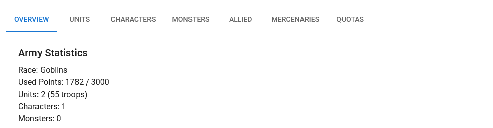 Armies are made up of Units and Characters of the same race, and Monsters, Allies and Mercenaries. The latter two may belong to a different race to the main units.