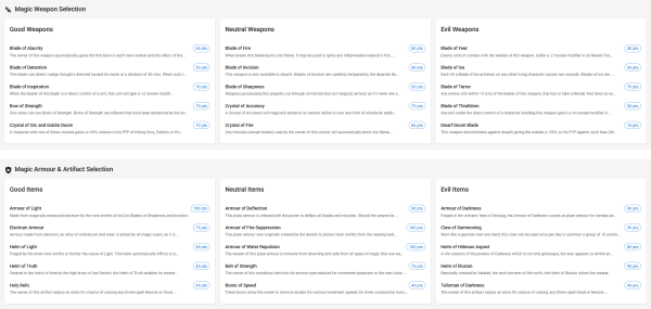 - Their standard (armours, weapons) and magical equipment (magical weapons or artefacts). Magical equipment is reserved for Characters of Major level or higher.
